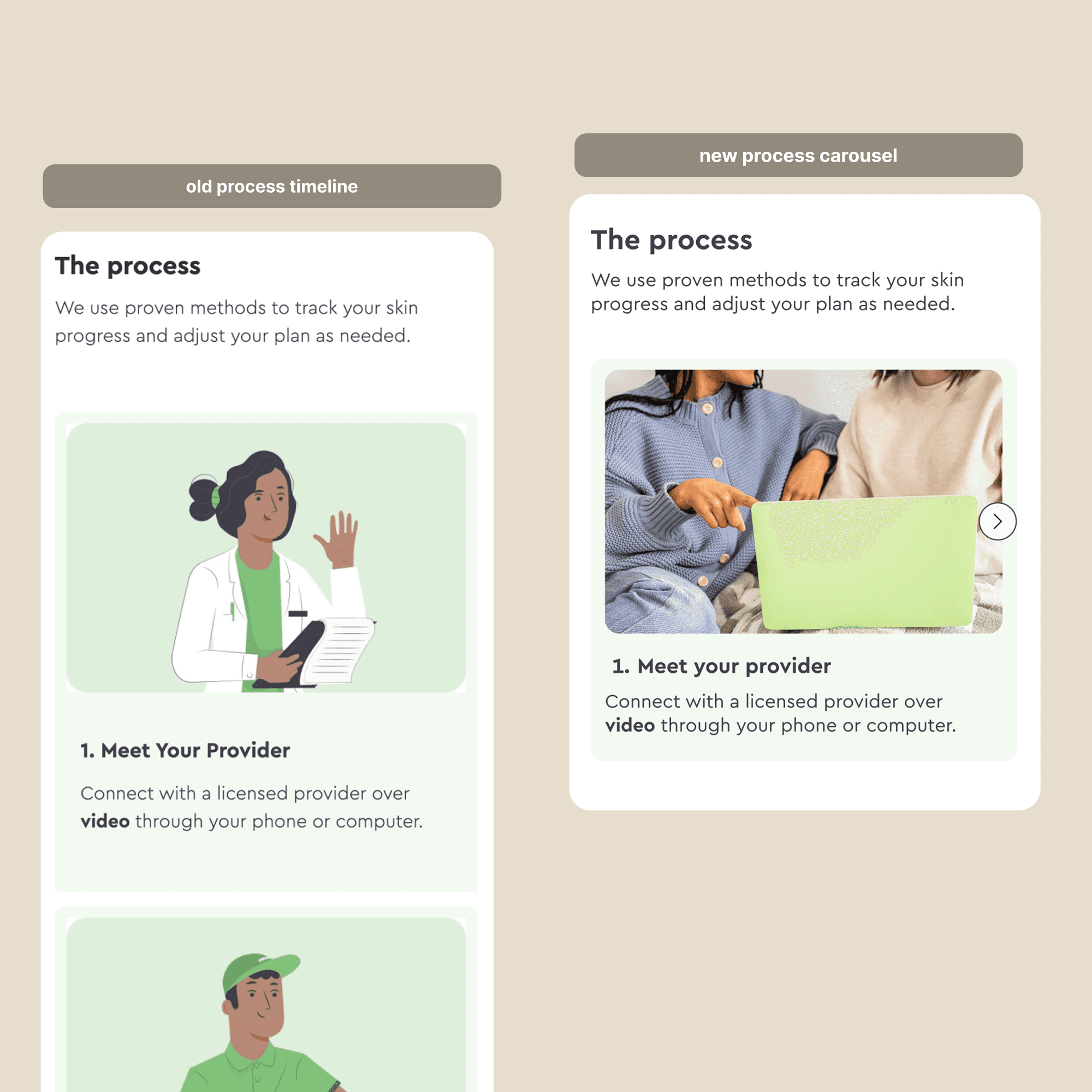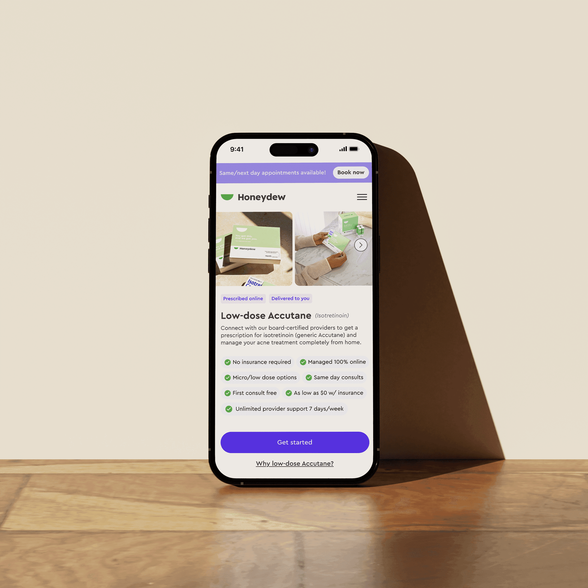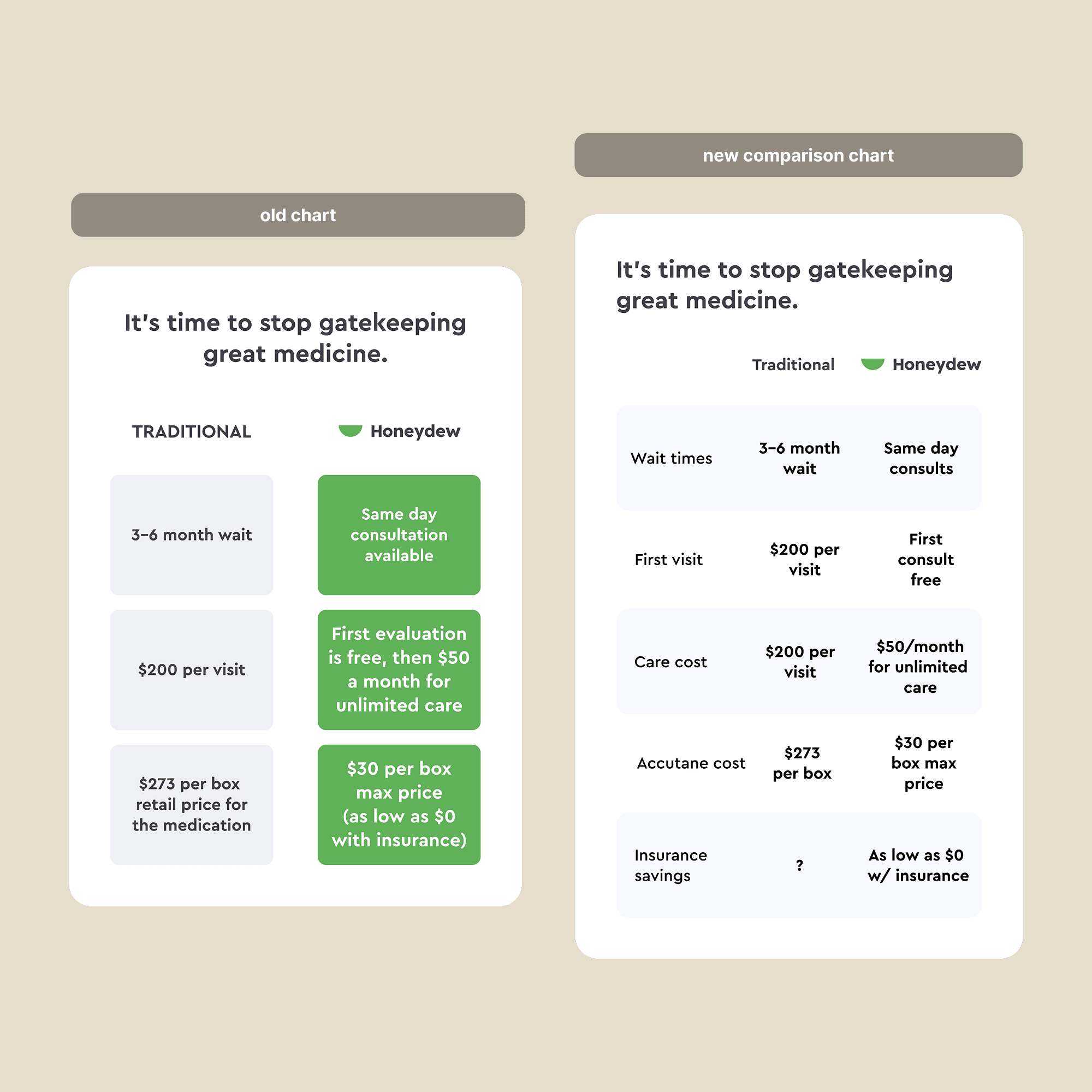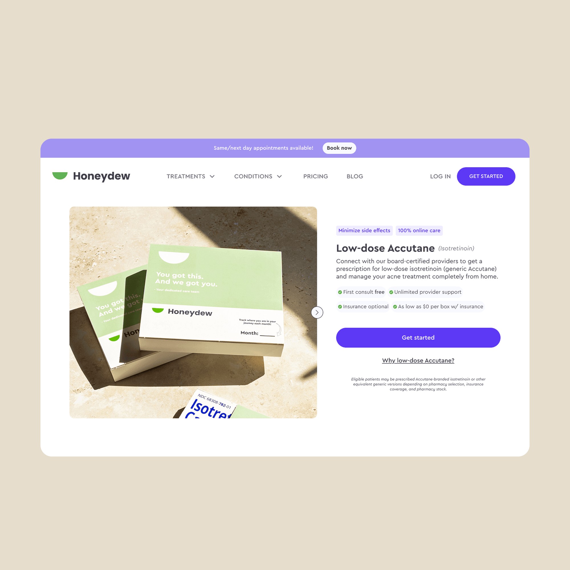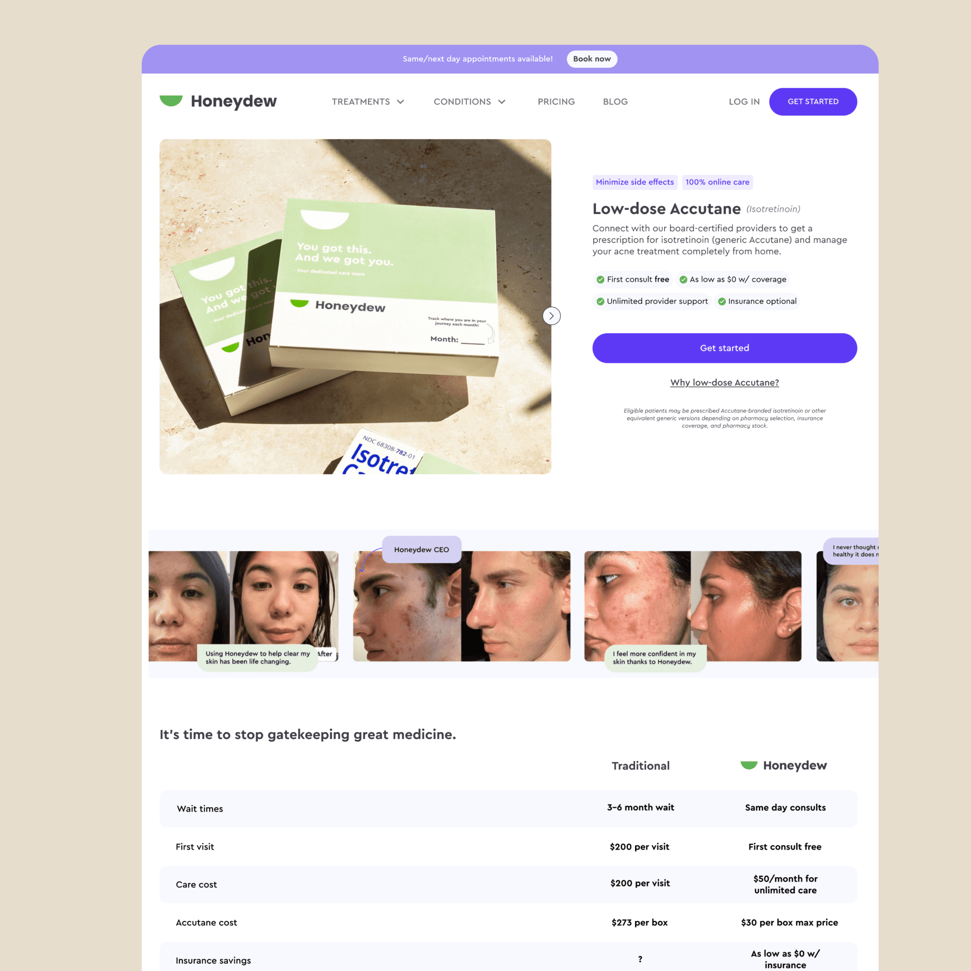 i redesigned honeydew’s low-dose accutane landing page to improve paid search performance, balancing business requirements with clearer value communication and faster scannability above the fold. the focus was on tightening hierarchy, reducing cognitive load, and reinforcing trust signals at key decision points. since launching an A/B test on paid search, the redesigned page is driving 22% higher CVR and 16% lower CAC, improving acquisition efficiency while maintaining compliance and clinical clarity.