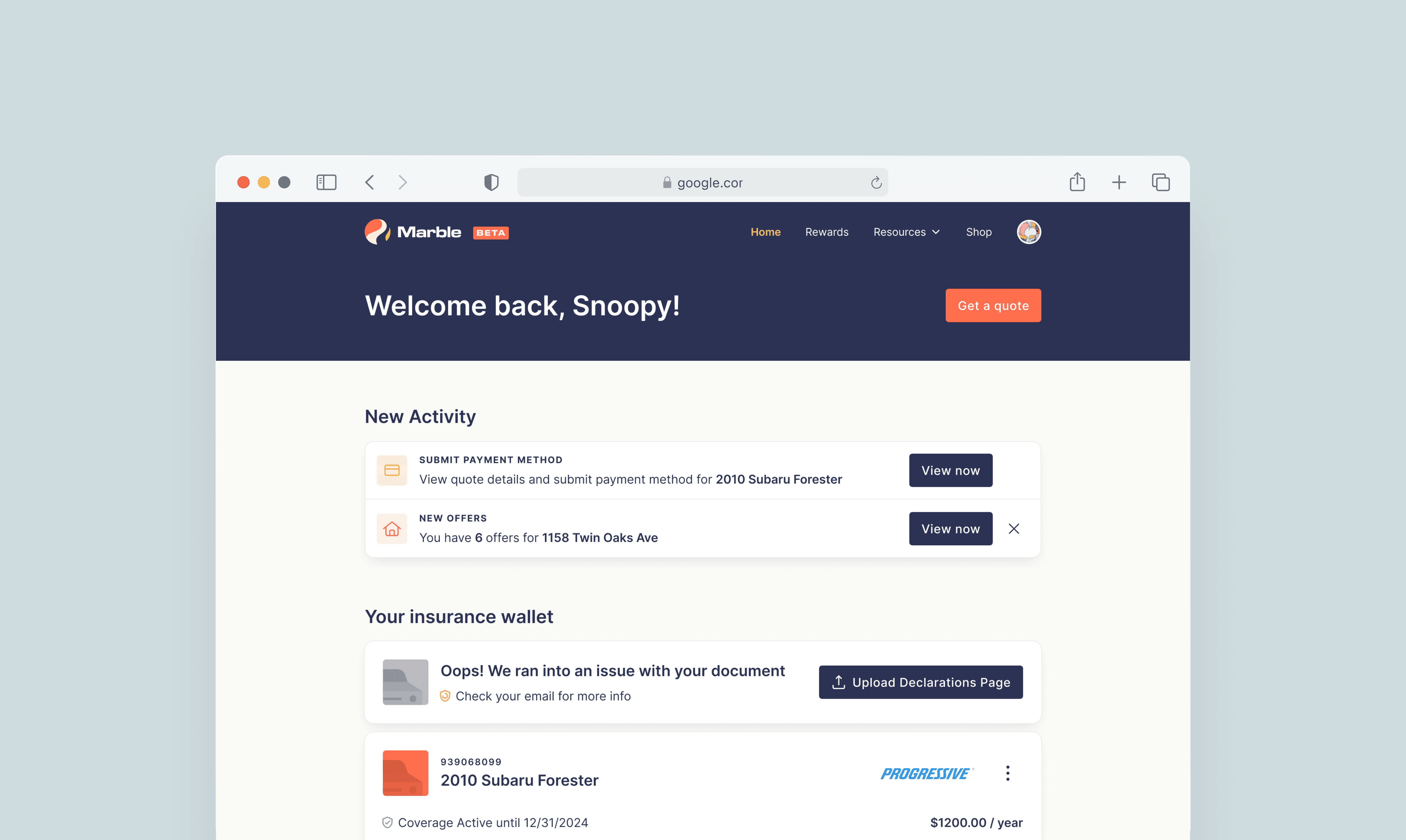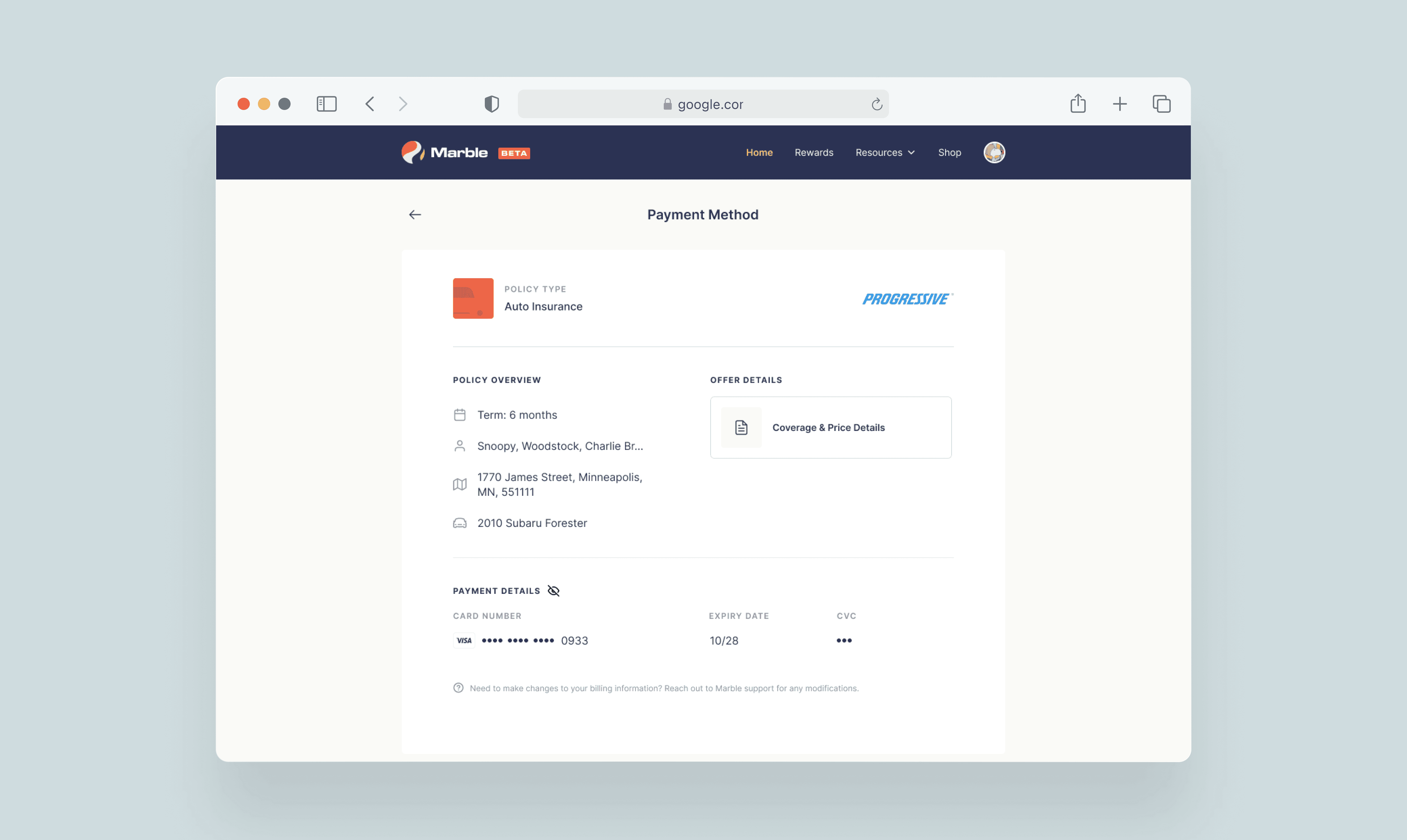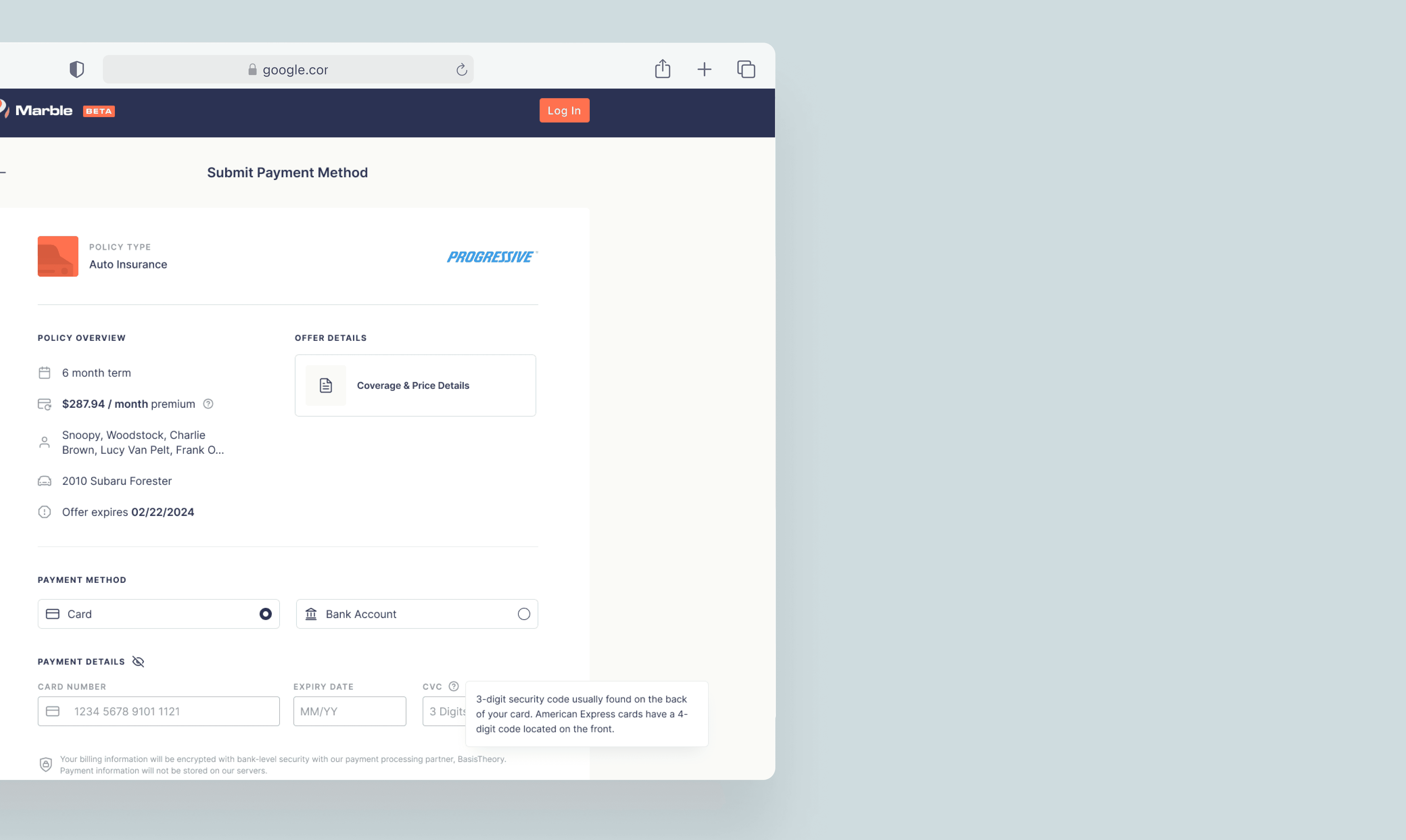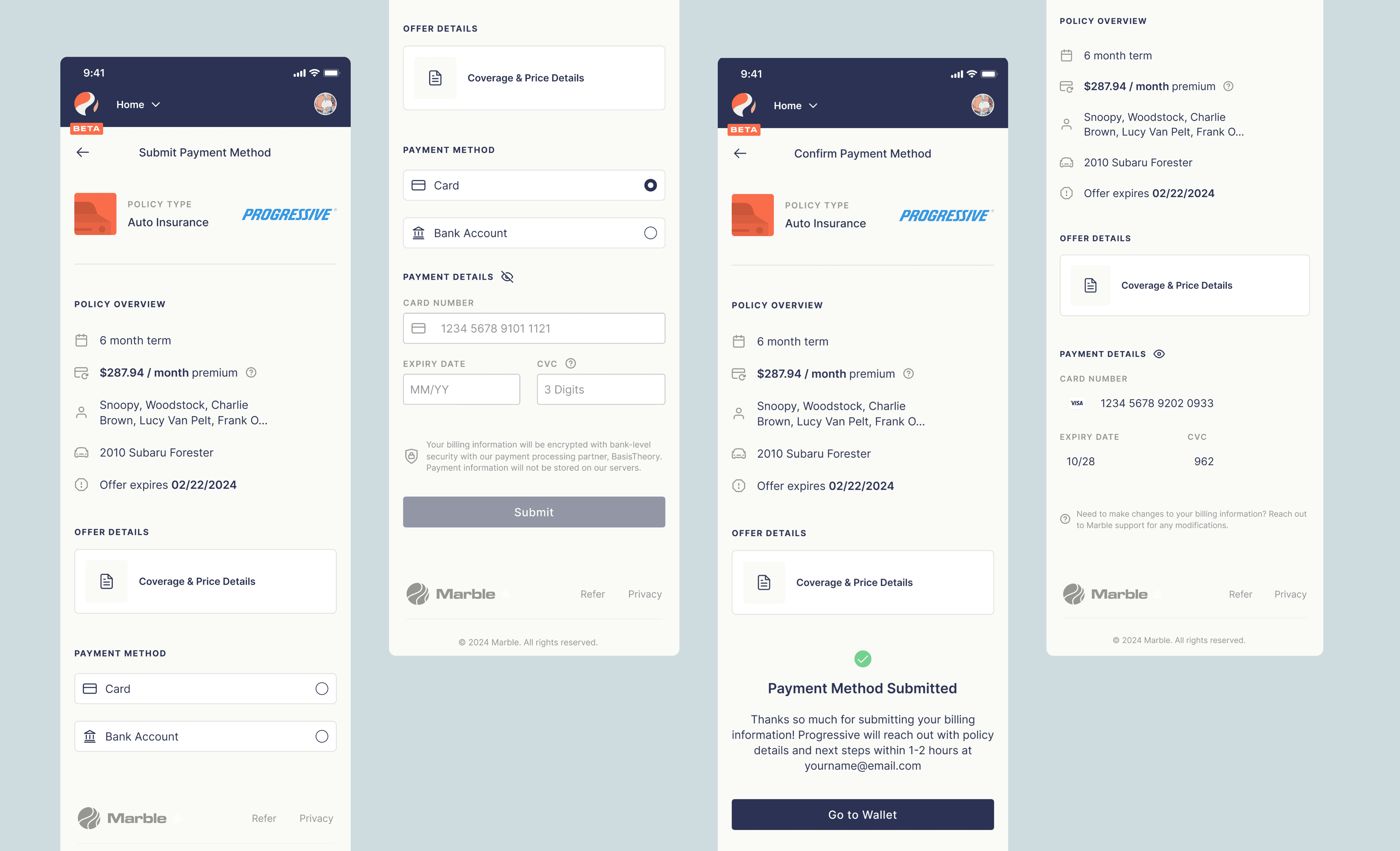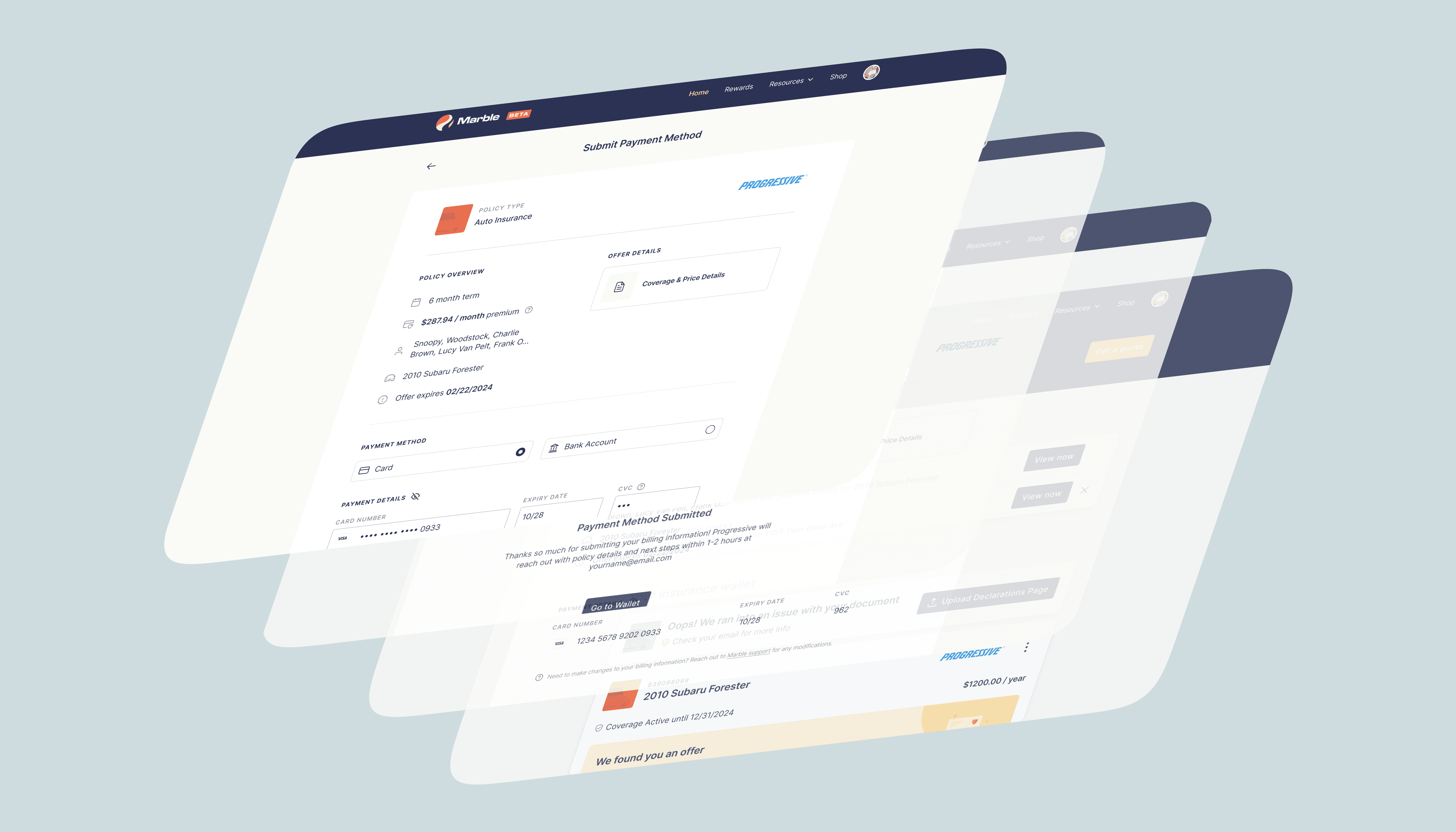 marble’s payment process was outdated and clunky — collecting card info over email or phone killed trust and wasted agent time. so we built a secure, user-friendly portal with BasisTheory. i led the design from research to launch, and despite limited resources, we saw 90%+ user adoption, cut agent handling time in half, and got payments in faster than ever.
