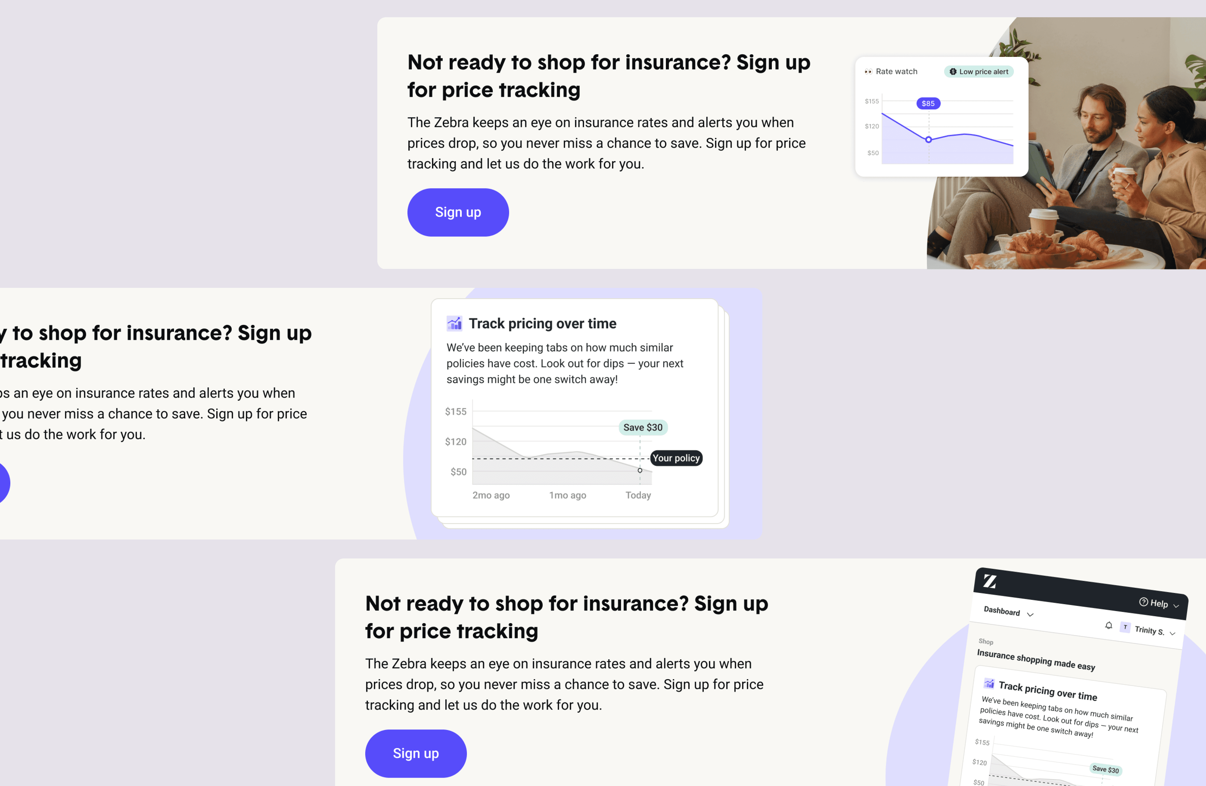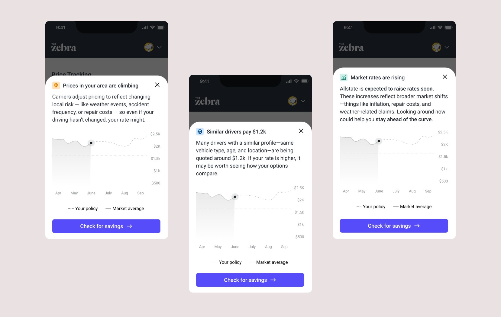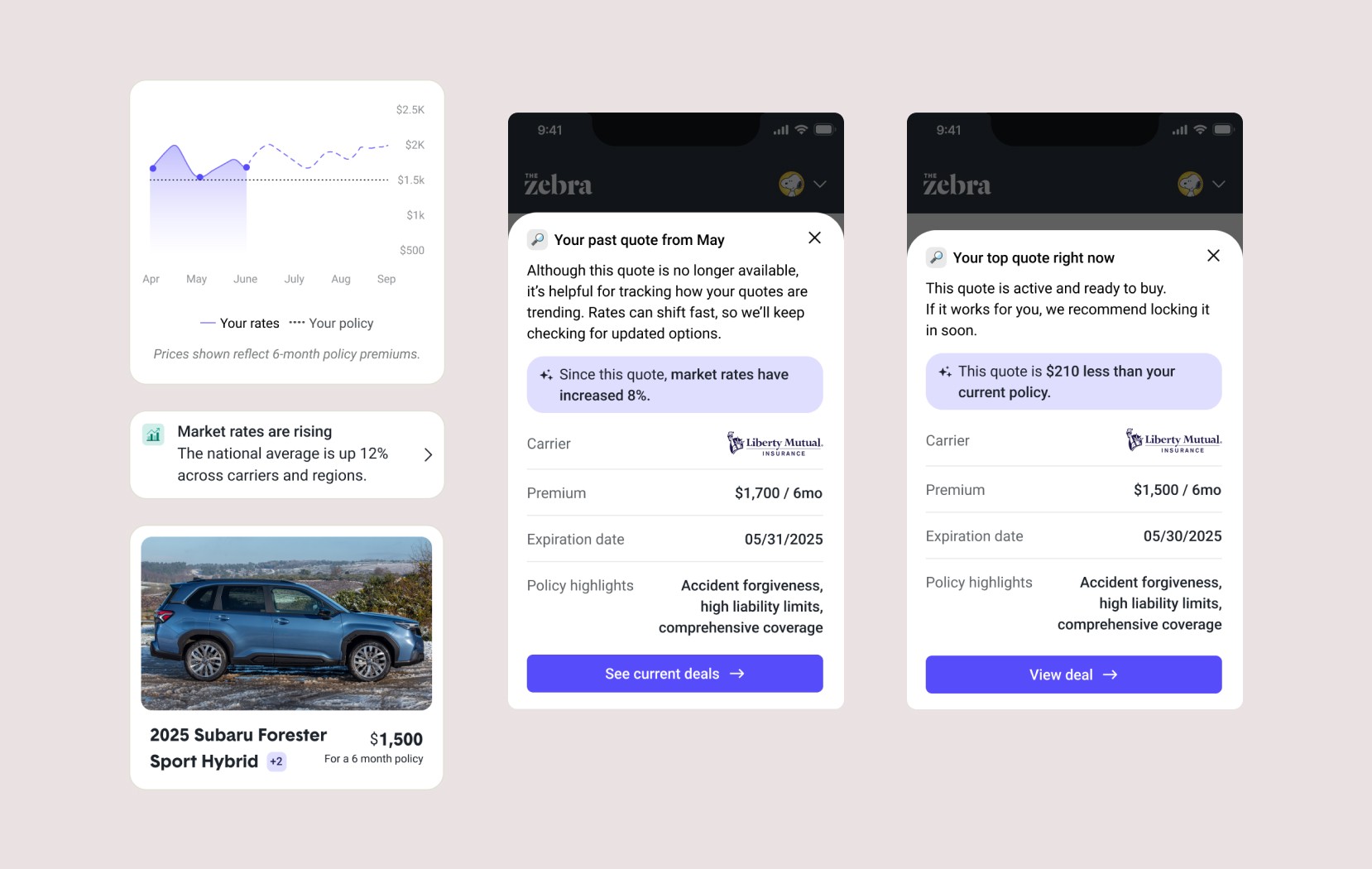 i led the design of a mobile-first price tracking tool to drive user engagement in The Zebra’s insurance hub. the focus was on simplifying rate comparisons with clear graphs and AI-driven insights. i also redesigned policy cards and ran user testing to refine UX. we launched to strong results: 77% dashboard interaction, and 60% quote engagement — boosting customer retention and lifetime value.