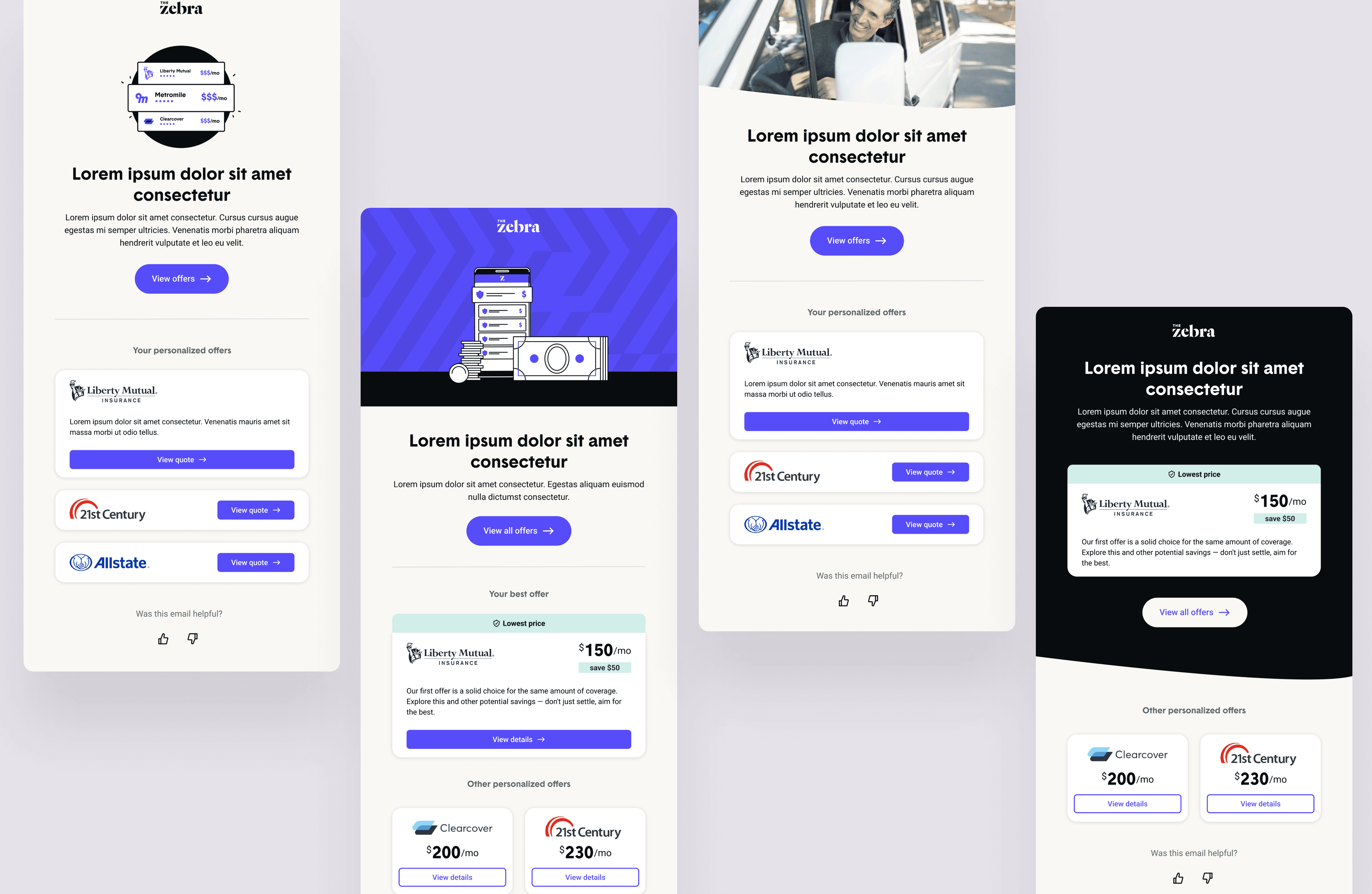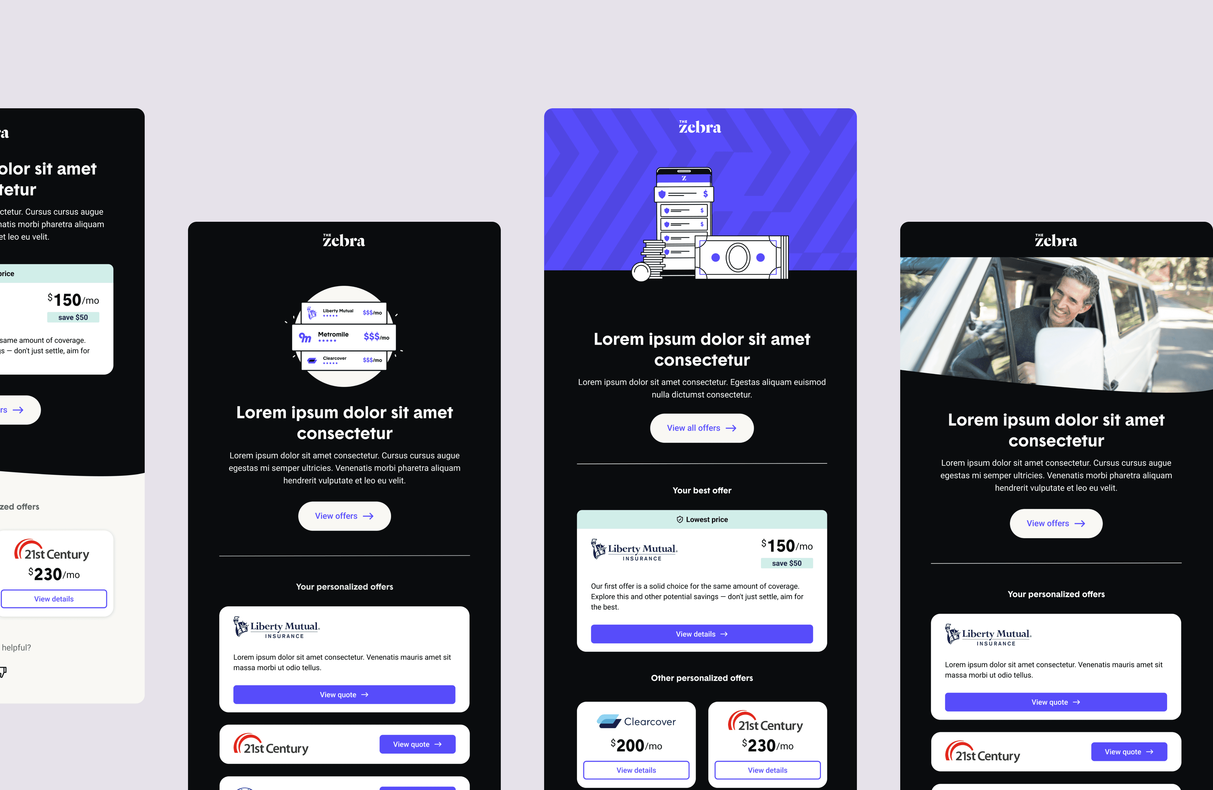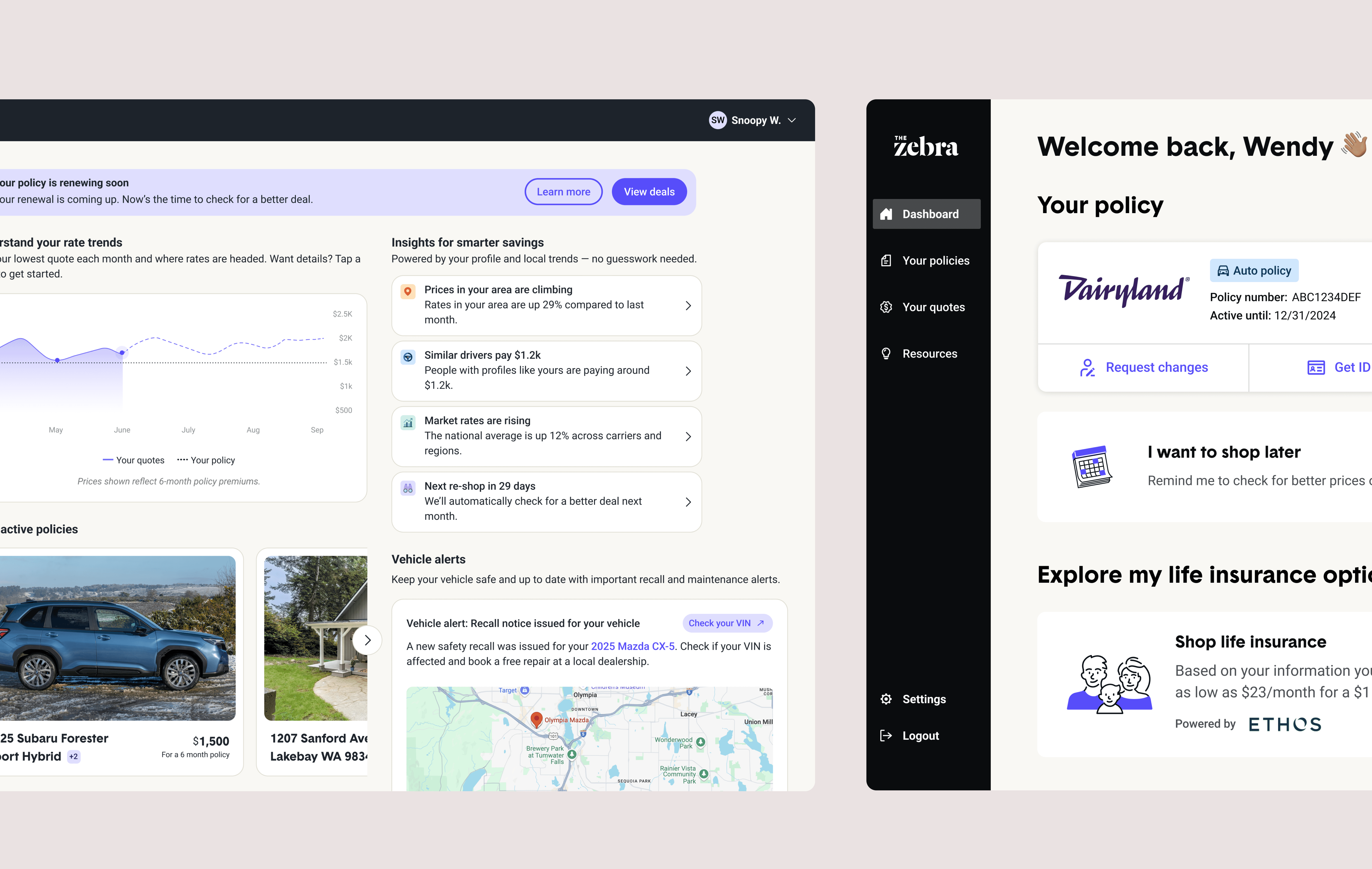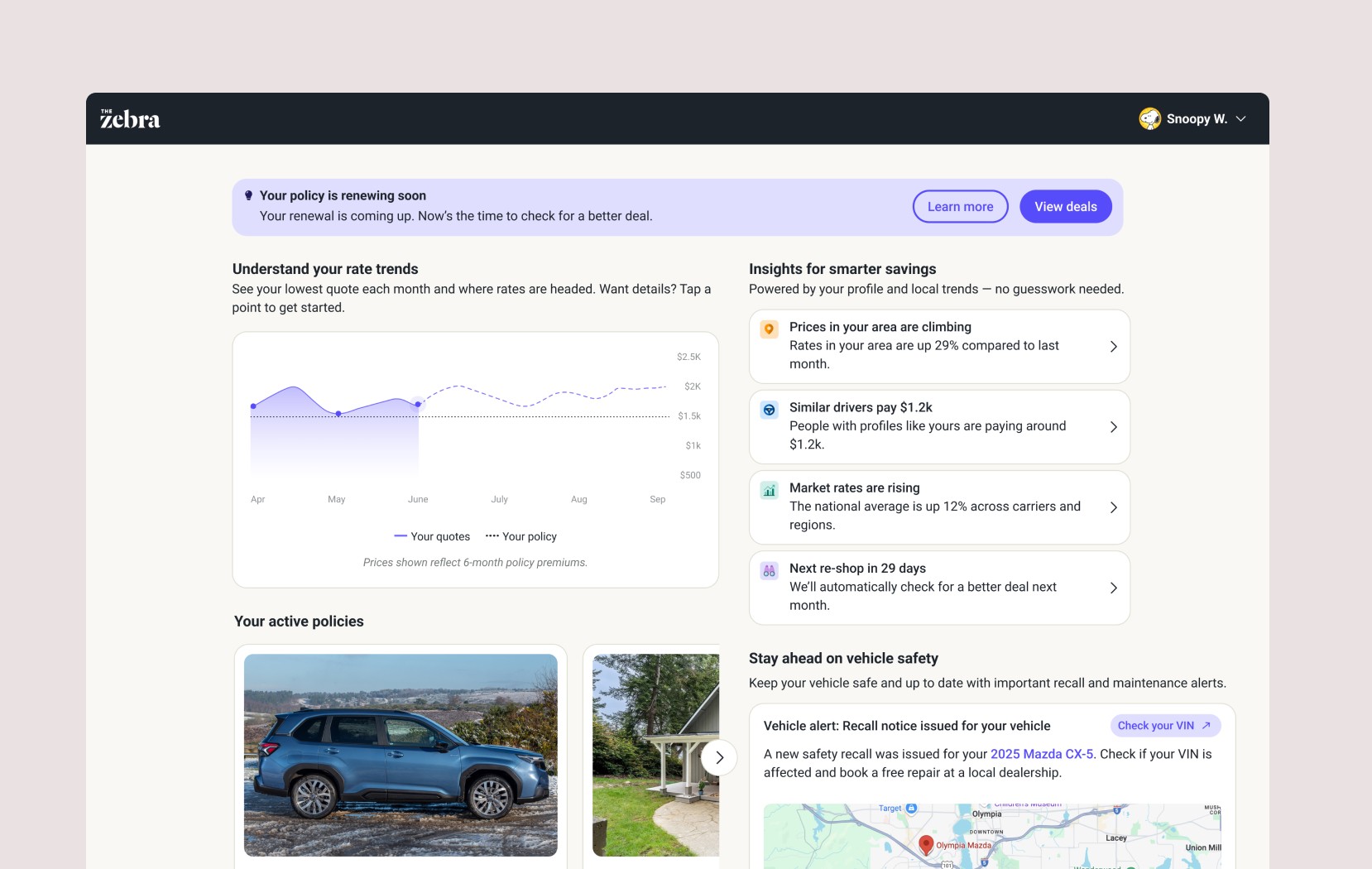 i led the design of a mobile-first price tracking tool to drive user engagement in The Zebra’s insurance hub. the focus was on simplifying rate comparisons with clear graphs and AI-driven insights. i also redesigned policy cards and ran user testing to refine UX. we launched to strong results: 77% dashboard interaction, and 60% quote engagement — boosting customer retention and lifetime value.