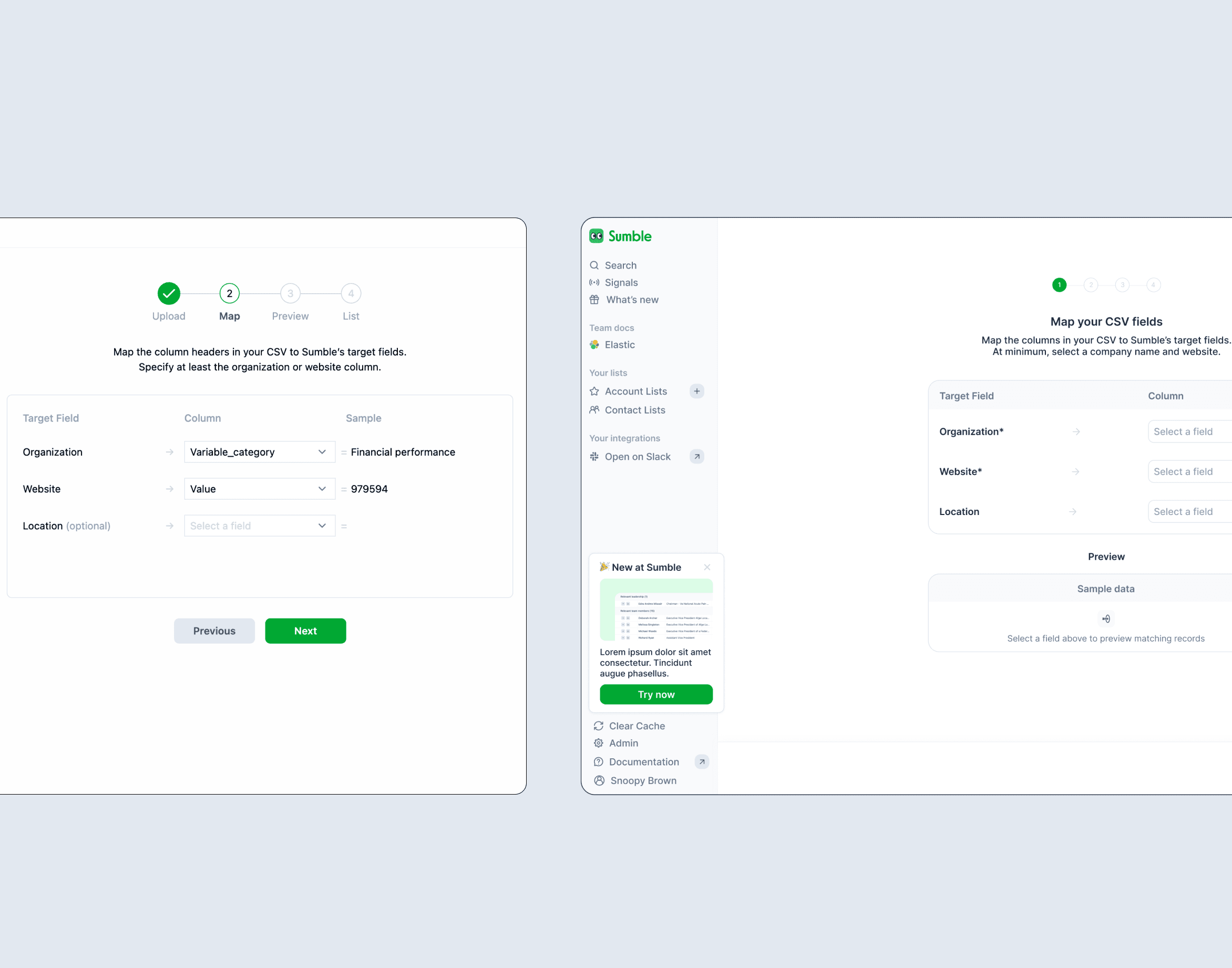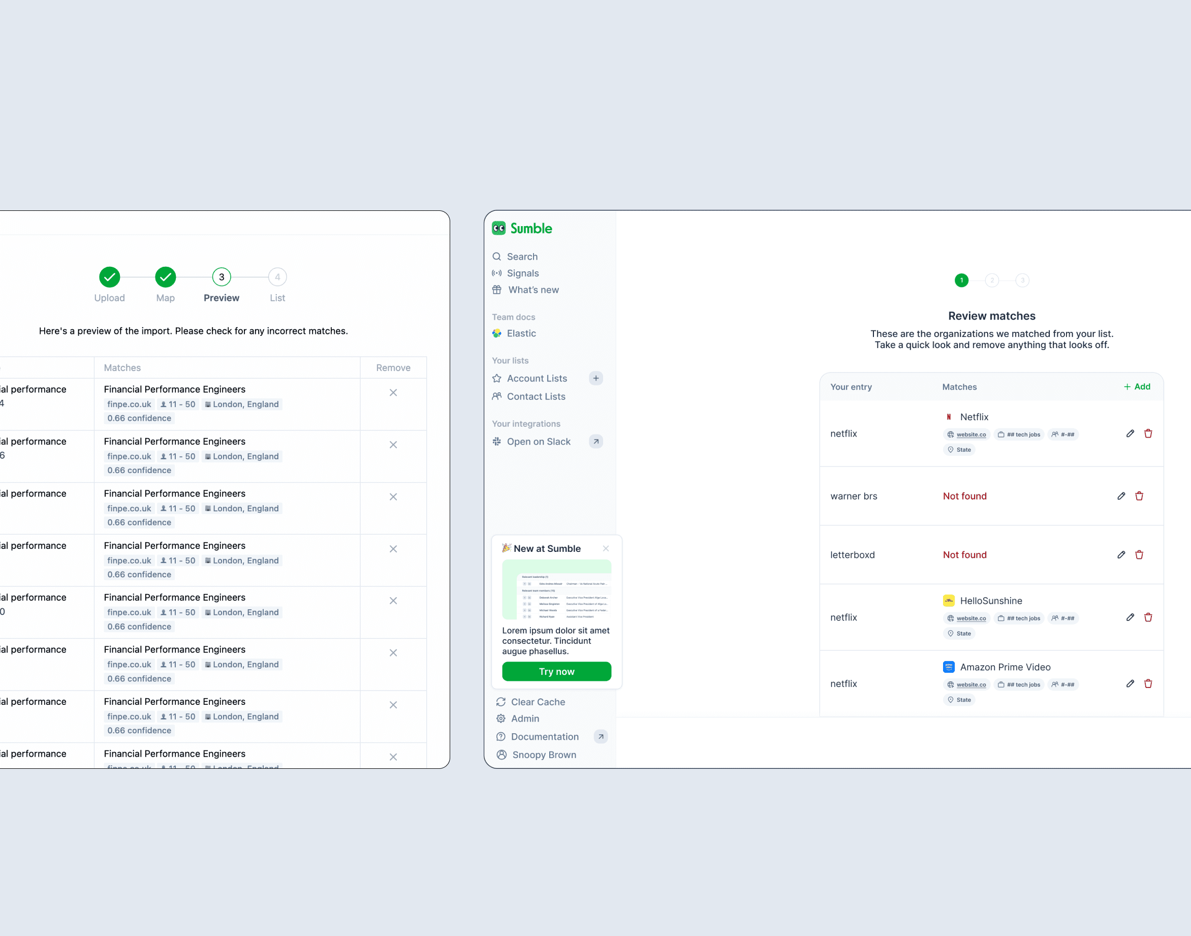 i redesigned sumble's account upload flow to reduce friction in list creation, replacing a rigid CSV-only import with a flexible paste-and-parse experience that lets users add domains or account names directly from a text box. the focus was on simplifying field mapping, streamlining the multi-step wizard, and surfacing smarter match previews to build confidence during import. this work also became a foundational piece of sumble's onboarding flow, giving new users a faster path to populating their account lists and unlocking the platform's automated research capabilities from day one.